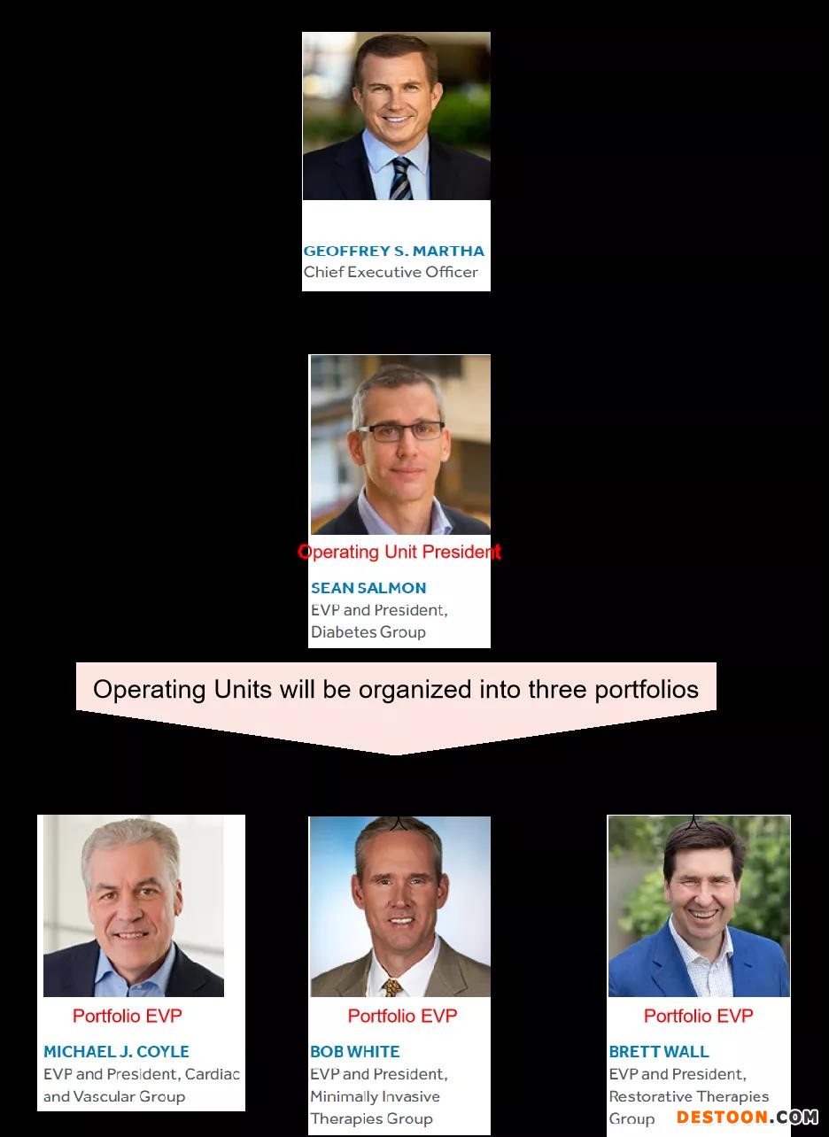 運(yùn)營(yíng)部門(mén)“Operating Units”將被分成三個(gè)子部門(mén)(Three Portfolios),由Mike Coyle(現(xiàn)心血管全球負(fù)責(zé)人), Brett Wall(現(xiàn)恢復(fù)性療法全球負(fù)責(zé)人), 以及Bob White(現(xiàn)微創(chuàng)外科全球負(fù)責(zé)人)擔(dān)任Portfolio Executive Vice President。