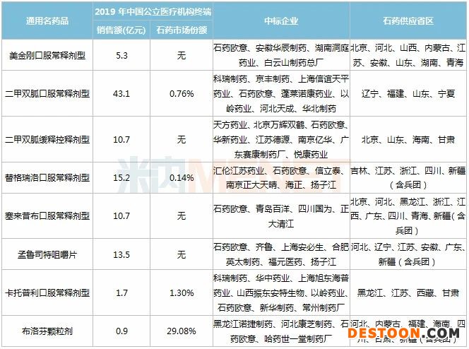 2019年中國公立醫(yī)療機構(gòu)終端競爭格局中,石藥在美金剛口服常釋劑型、二甲雙胍口服常釋劑型、二甲雙胍緩釋控釋劑型、替格瑞洛口服常釋劑型、塞來昔布口服常釋劑型、孟魯司特咀嚼片、卡托普利口服常釋劑型7個品種所占市場份額較低或為0,中標(biāo)后有望迅速開拓市場。