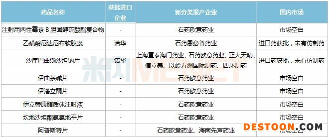 兩性霉素B為多烯類抗真菌抗生素,國內(nèi)該產(chǎn)品尚無復(fù)合物產(chǎn)品獲批,石藥獨家報產(chǎn)且以“臨床急需、市場短缺的藥品注冊申請”納入優(yōu)先審評;尼達(dá)尼布是由諾華研發(fā)的一種口服小分子酪氨酸激酶抑制劑,2019年全球銷售額超過15億美元;由日本協(xié)和發(fā)酵麒麟株式會社研發(fā)的伊曲茶堿是全球首個腺甘A2A受體拮抗劑,可與含左旋多巴的藥品聯(lián)合使用,用于改善帕金森病人的劑末現(xiàn)象,原研產(chǎn)品還未進入國內(nèi)市場;阿普斯特是由新基研發(fā)的PDE-4抑制劑(已被安進收購),2019年全球銷售額超過15億美元,石藥集團于2020年3月首家以仿制3類報產(chǎn)。