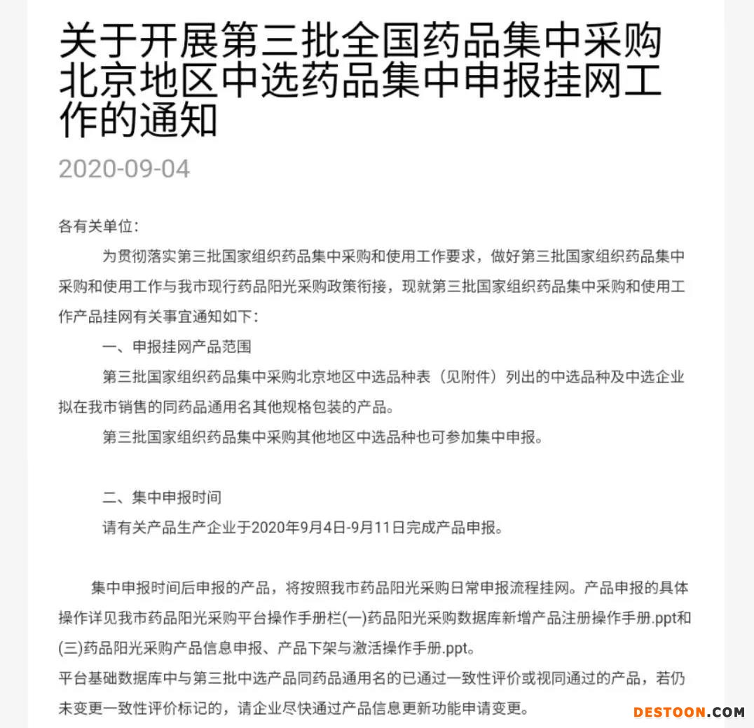 9月4日,北京市藥品陽光采購微平臺(tái)發(fā)布《關(guān)于開展第三批全國藥品集中采購北京地區(qū)中選藥品集中申報(bào)掛網(wǎng)工作的通知》,安排第三批國家組織藥品集中采購和使用工作產(chǎn)品掛網(wǎng)有關(guān)事宜。