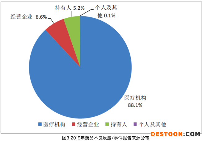 從《國(guó)家藥品不良反應(yīng)監(jiān)測(cè)年度報(bào)告(2019年)》數(shù)據(jù)統(tǒng)計(jì)來看,2019年來自醫(yī)療機(jī)構(gòu)的報(bào)告占88.1%;來自經(jīng)營(yíng)企業(yè)的報(bào)告占6.6%;來自持有人的報(bào)告占5.2%;來自個(gè)人及其他報(bào)告者的報(bào)告占0.1%。