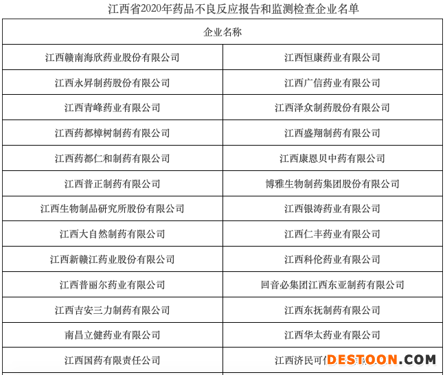 根據(jù)通知要求,江西省藥監(jiān)局將組織檢查人員對(duì)以下名單內(nèi)企業(yè)開展不良反應(yīng)報(bào)告和監(jiān)測(cè)現(xiàn)場(chǎng)專項(xiàng)檢查,一共33家藥企,檢查時(shí)間為9月下旬。
