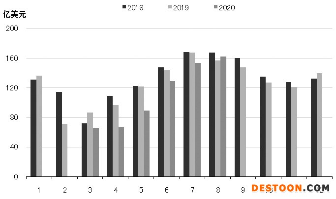 2020年1—8月,紡織服裝累計(jì)出口1874.07億美元,增長8.11%(全國貨物貿(mào)易出口下降2.3%)。其中,紡織品出口1047.98億美元,增長33.43%,出口額創(chuàng)歷史同期最高水平;服裝出口826.09億美元,下降12.86%,出口額創(chuàng)近十年以來同期最低水平。紡織品與服裝出口顯著分化,紡織品成為拉動(dòng)紡織品服裝出口增速由負(fù)轉(zhuǎn)正的關(guān)鍵動(dòng)力。