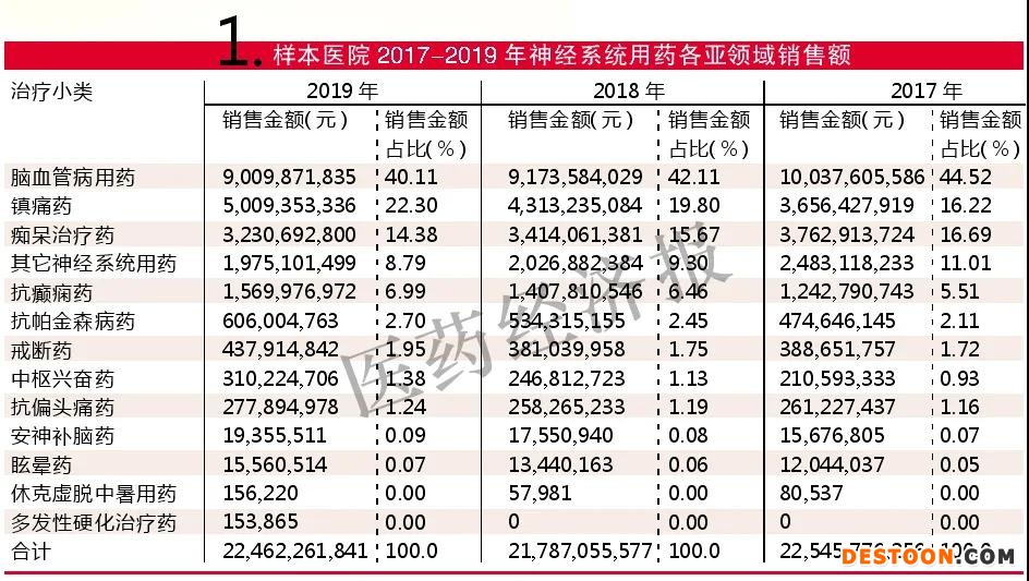 樣本醫(yī)院2017-2019年神經(jīng)系統(tǒng)用藥各亞領(lǐng)域銷售額