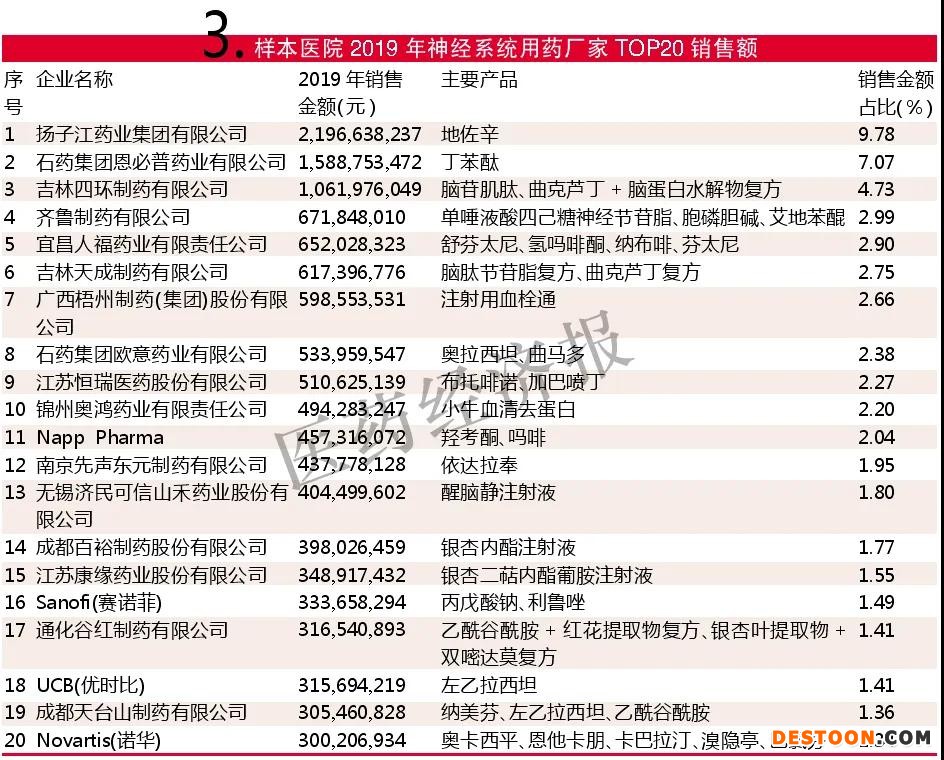 樣本醫(yī)院2019年神經(jīng)系統(tǒng)用藥廠家Top 20銷售額