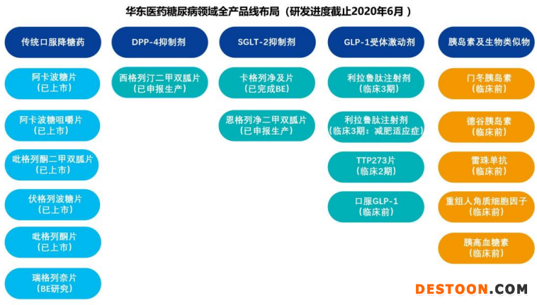 為保持國內(nèi)糖尿病市場領(lǐng)先地位,華東醫(yī)藥在糖尿病領(lǐng)域形成創(chuàng)新靶點加差異化仿制藥產(chǎn)品管線的整體布局,從仿制+創(chuàng)新+生物大分子三個維度,構(gòu)筑了逐步升級、對核心治療靶點與臨床主流用藥全布局的產(chǎn)品矩陣。在研產(chǎn)品作用機制涵蓋DPP-4抑制劑、SGLT-2抑制劑、GLP-1創(chuàng)新藥及其類似物、胰島素類似物以及治療糖尿病并發(fā)癥的單抗等產(chǎn)品。