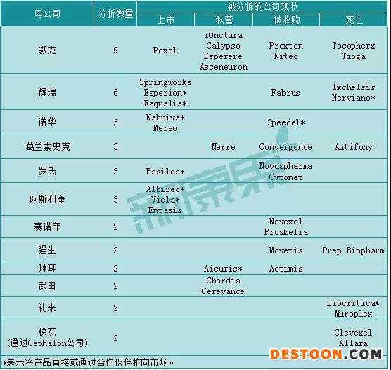 據(jù)統(tǒng)計,有39家此類公司走上了獨立的發(fā)展之路,從母公司及拆分時間看,它們大都是在過去10年間從12家全球大型制藥商中拆分出來的。其中,10家已成功上市,8家仍為私有企業(yè),11家已被收購,剩余10家要么破產(chǎn)、要么似乎不再活躍。