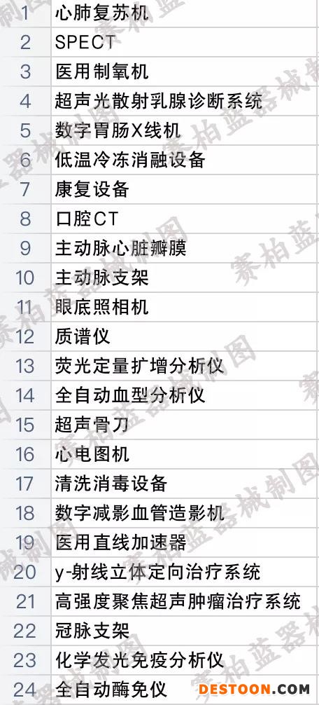 動態(tài)調(diào)整品目包括心電圖機(jī)、清洗消毒設(shè)備、數(shù)字減影血管造影機(jī)、醫(yī)用直線加速器、γ-射線立體定向治療系統(tǒng)、高強(qiáng)度聚焦超聲腫瘤治療系統(tǒng)、冠脈支架、化學(xué)發(fā)光免疫分析儀、全自動酶免儀。