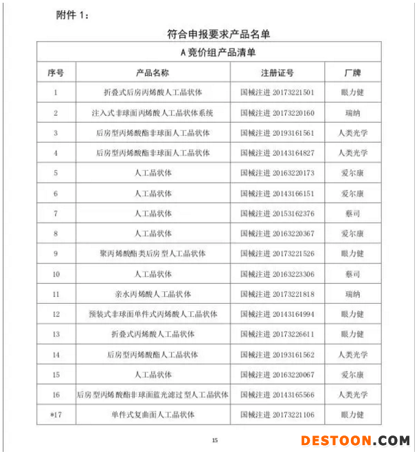 在劃分出A、B兩個(gè)競(jìng)價(jià)組之后,根據(jù)球面/非球面、預(yù)裝/非預(yù)裝、單片/三片等3項(xiàng)功能屬性,每個(gè)競(jìng)價(jià)組又進(jìn)行了產(chǎn)品的再分類,3項(xiàng)功能屬性均相同的,劃入同一分類,而每一分類也有著不同的入圍基準(zhǔn)價(jià)。