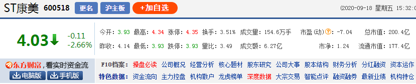 9月3日,ST康美復(fù)牌,受到此利好消息刺激,連續(xù)9個(gè)交易日漲停,在此期間,因股價(jià)連續(xù)漲停,ST康美多次發(fā)布風(fēng)險(xiǎn)提示公告;9月16日,ST康美開盤漲停,正當(dāng)投資者以為第10個(gè)漲??梢允杖肽抑械臅r(shí)候,股價(jià)突然跳水,最終當(dāng)天上演了“天地板”,以跌停收盤;9月17日,ST康美繼續(xù)跌停;截至9月18日收盤,市值200億元。對此,有業(yè)內(nèi)人士分析指出,由于ST股的基本面較差,投資者應(yīng)注意風(fēng)險(xiǎn),要理性看待、認(rèn)真分析其原因和影響,避免盲目追漲,跟風(fēng)炒作,造成不必要的損失。