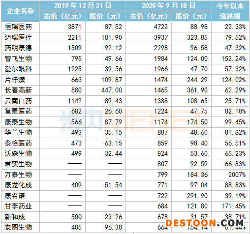 9月21日訊 日前,千億市值的“醫(yī)藥茅臺”長春高新股價(jià)突然跌停,4天市值蒸發(fā)超200億;康美藥業(yè)獲國資接盤,復(fù)牌后9連板漲停再現(xiàn)“天地板”,昔日千億市值僅剩200億;千山藥機(jī)被深交所摘牌,跌幅創(chuàng)A股紀(jì)錄,暴跌99.75%,資料顯示,千山藥機(jī)有近5萬戶股東,近年來公司深陷年報(bào)造假、占用資金風(fēng)波,近三年凈利潤虧損合計(jì)超過35億元,而今在資本市場最終以退市收場。目前,A股市場上,恒瑞醫(yī)藥、邁瑞醫(yī)療、藥明康德、智飛生物、片仔癀等10只醫(yī)藥股市值均超千億規(guī)模。截至9月18日收盤,恒瑞醫(yī)藥仍以4722億元市值居于首位,邁瑞醫(yī)療緊跟其后;此外,片仔癀市值超越云南白藥,成為了中藥板塊市值龍頭。