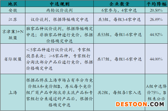 橫向對比中選規(guī)則,在最初進行集采的安徽和江蘇兩個省份,由于參與企業(yè)較少,均采取了議價談判的方式。安徽省選擇兩輪議價,而江蘇省則根據(jù)降價的幅度確定中選品種。在參與的企業(yè)數(shù)量增多之后,京津冀3+N聯(lián)盟采用了分組的方式,較少品種的組采取議價的方式,而較多品種的組采取了競價的方式,這種競價議價結合的方式,可以在參加企業(yè)數(shù)量增加后,保證價格充分降低。在京津冀聯(lián)盟的競價規(guī)則基礎上,省際聯(lián)盟引入了專家組評分以保證最終中選產品的質量,議價組根據(jù)專家組表決決定入選,而競價組首先根據(jù)專家打分淘汰部分產品后,再在剩余的產品中根據(jù)價格決定中選。上海市的集采規(guī)則放棄了議價組,但新增了市場占有率的因素,旨在降價的同時,不改變臨床的使用習慣。