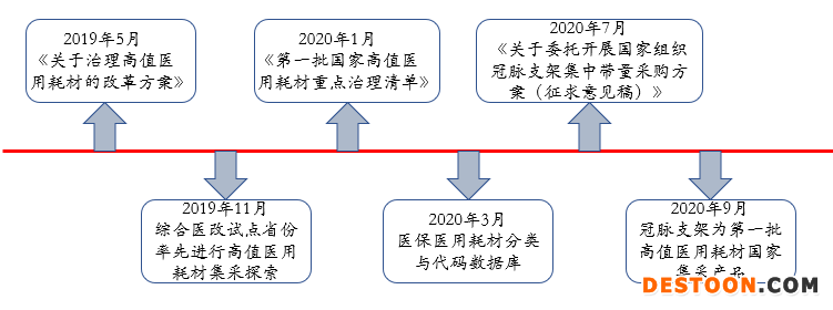 進入到2020年,相關機構又發(fā)布了一系列文件為高值醫(yī)用耗材的國家集采保駕護航。這些文件都在為醫(yī)療耗材的管理提供了一個抓手,解決了過往醫(yī)用耗材標準不清晰、編碼不統(tǒng)一的問題,為深化高值醫(yī)療耗材改革提供了基礎。2020年7月,國家醫(yī)保局發(fā)布名為《關于委托開展國家組織冠脈支架集中帶量采購方案(征求意見稿)》的文件,并在文中提到從冠脈支架入手探索開展國家高值醫(yī)用耗材集中帶量采購,推動建立規(guī)范化、常態(tài)化的高值醫(yī)用耗材集中帶量采購制度,并于9月正式確定了冠脈支架為第一批高值醫(yī)用耗材國家集采產品。