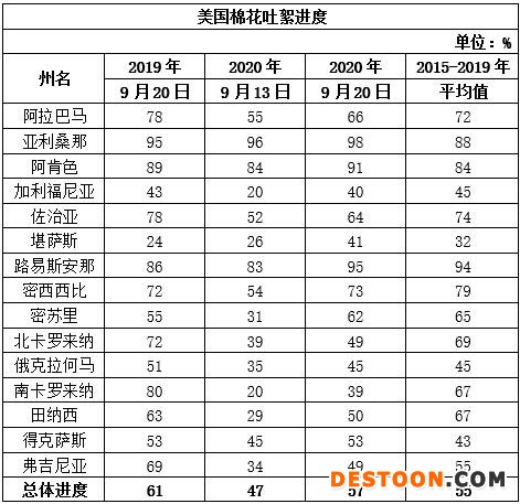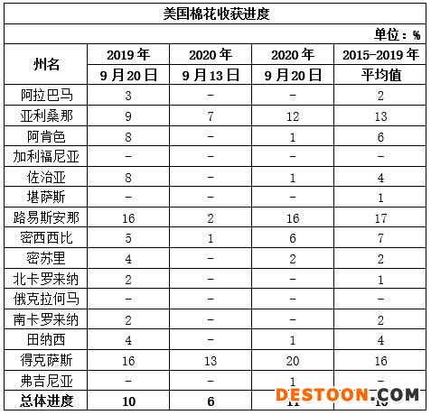 美國農(nóng)業(yè)部9月21日發(fā)布的美國棉花生產(chǎn)報告顯示,截至2020年9月20日,美國棉花吐絮進度為57%,比去年同期減少4個百分點,比過去五年平均值增加2個百分點。美國棉花收獲進度為11%,比去年同期增加1個百分點,較過去五年平均值增加1個百分點。美國棉花生長狀況達到良好以上的占45%,與前周持平,較去年同期增加5個百分點。