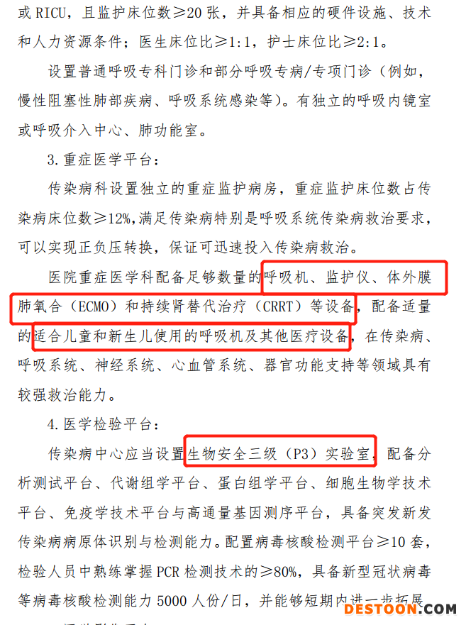 其中,要求重癥醫(yī)學科配備足夠數(shù)量的呼吸機、監(jiān)護儀、體外膜肺氧合(ECMO)和持續(xù)腎替代治療(CRRT)等設備,配備適量的適合兒童和新生兒使用的呼吸機及其他醫(yī)療設備。
