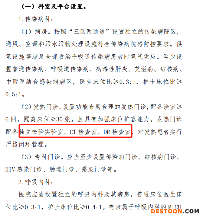傳染病院區(qū)按照“三區(qū)兩通道”設置,傳染病救治床位數(shù)≥醫(yī)院編制床位數(shù)的20%??剖业呐渲蒙?,應由核心科室(專業(yè))和支撐科室(專業(yè))組成。