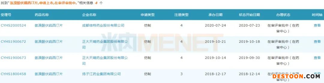 在此之前,該產(chǎn)品揚子江以仿制3類、正大天晴藥業(yè)集團(tuán)和成都倍特藥業(yè)以仿制4類提交上市申請在審評審批中(在藥審中心)。從承辦日期來看,揚子江的時間最早。