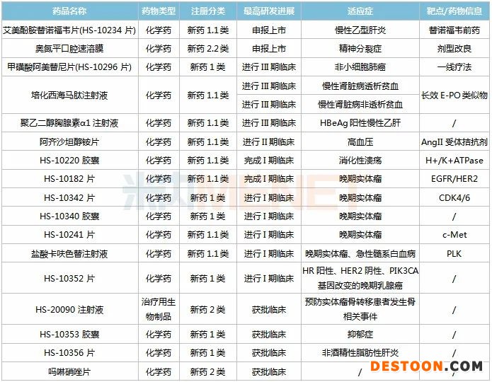 在抗腫瘤領(lǐng)域,HS-10296片(EGFR-TKI抑制劑)針對EGFR-T790M突變的非小細胞肺癌適應(yīng)癥已獲批上市,EGFR突變的非小細胞肺炎(一線療法)適應(yīng)癥正在進行III期臨床,其他適應(yīng)癥也陸續(xù)申報臨床;HS-10241片(c-Met抑制劑)、HS-10342片(CDK4/6抑制劑)、鹽酸卡呋色替注射液(PLK抑制劑)等用于實體瘤的1類新藥均在開展I期臨床。