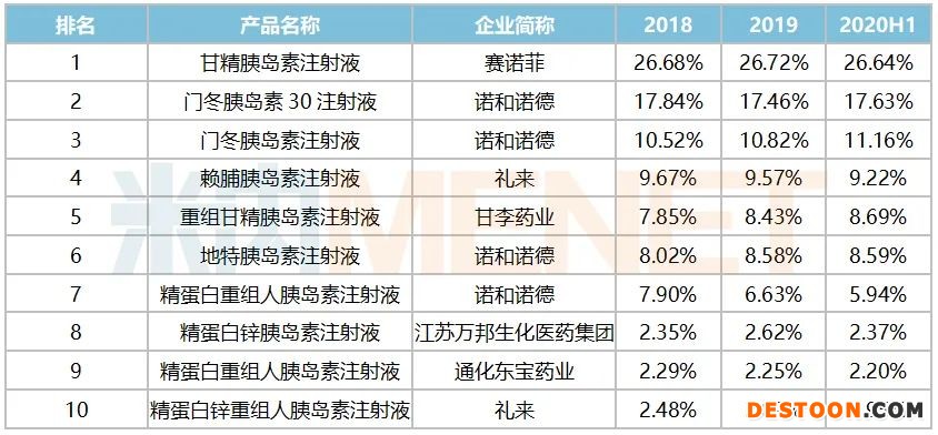 從TOP10品牌來看,國產(chǎn)品牌占了三個(gè)席位:甘李藥業(yè)的重組甘精胰島素注射液直接沖擊的是賽諾菲重磅產(chǎn)品甘精胰島素注射液,從該品種競爭企業(yè)的份額來看,賽諾菲從2018年的76.99%下滑至2020上半年的74.48%,而甘李藥業(yè)則從2018年22.65%上漲至2020上半年的24.30%。