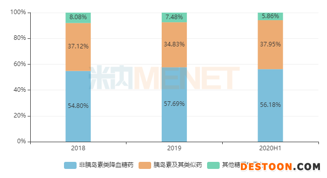 米內(nèi)網(wǎng)數(shù)據(jù)顯示,最近幾年在重點(diǎn)省市公立醫(yī)院終端,非胰島素類降血糖藥依然是糖尿病用藥的主力,但胰島素及類似藥的市場(chǎng)份額也在逐漸上漲。2020上半年受疫情影響,患者到醫(yī)院就診的頻率下滑,但該小類的市場(chǎng)份額依然樂觀,占比上漲至38%左右。