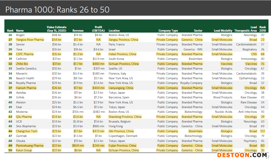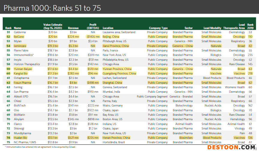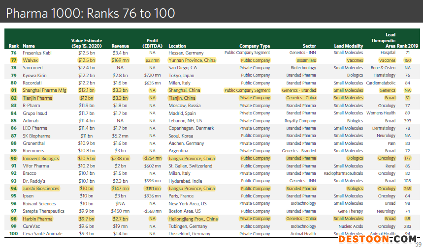 華蘭生物以5.21億美元的年收入和131億美元市值,排名千強藥企第74位,較2019年上升136個位次。