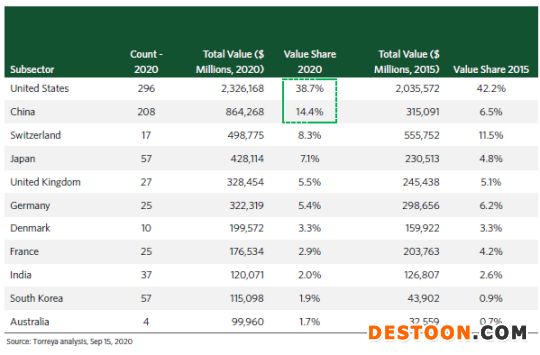 過去5年,制藥產(chǎn)業(yè)發(fā)展從以美國、瑞士、德國、法國為主的西方發(fā)達國家,逐步轉(zhuǎn)移至中國、日本、韓國所在的亞洲地區(qū)。其中,中國地區(qū)尤為突出,制藥業(yè)產(chǎn)值增加了超過3500億美元,增長比約為100%。同時占全球總價值比例從2015年的6.5% 躥升至2020年9月的14.4%,超越瑞士成為僅次于美國的國家,同期美國下跌了3.5%,瑞士下跌了3.2%,日本上升了2.3%。