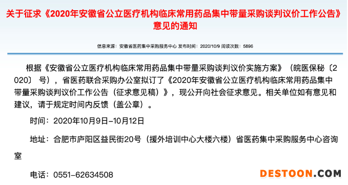 10月10日訊 10月9日,安徽省醫(yī)藥集中采購(gòu)平臺(tái)發(fā)布《關(guān)于征求<2020年安徽省公立醫(yī)療機(jī)構(gòu)臨床常用藥品集中帶量采購(gòu)談判議價(jià)工作公告>意見(jiàn)的通知》(以下簡(jiǎn)稱“征求意見(jiàn)稿”),將對(duì)臨床常用呼吸系統(tǒng)用藥、抑酸藥、肝膽疾病用藥及醫(yī)學(xué)影像對(duì)比劑四類藥品進(jìn)行集中帶量采購(gòu)談判議價(jià),擬談判藥品總數(shù)多達(dá)231個(gè)。這些藥品將分別選取占2019年度該省公立醫(yī)療機(jī)構(gòu)四類采購(gòu)額前90%的產(chǎn)品,并結(jié)合臨床實(shí)際組織專家遴選確定。