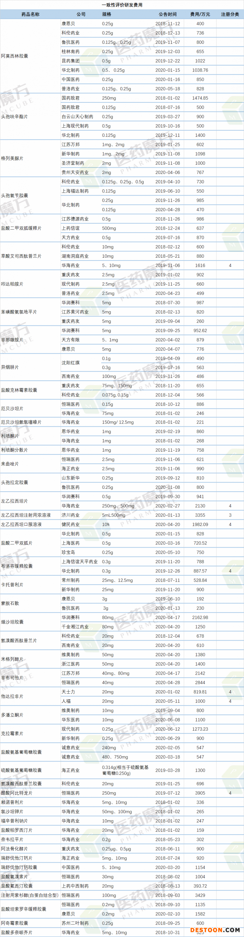 183個藥品一致性評價研發(fā)費用匯總:67個高于1000萬