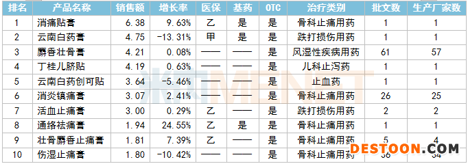 2019年中國城市零售藥店終端中成藥貼膏劑產(chǎn)品TOP10(單位:億元)