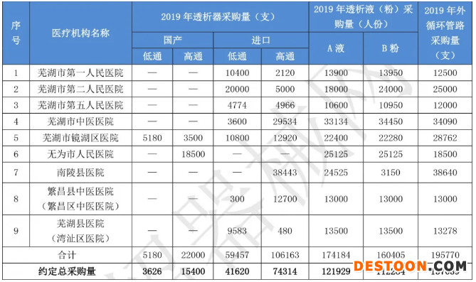 根據(jù)《意見稿》,蕪湖市所有公立醫(yī)療機構(gòu)將對血透類醫(yī)用耗材中透析器、透析液(粉)、體外循環(huán)血路三個品種進行帶量采購,采購量不低于全市公立醫(yī)療機構(gòu)上年度同期該產(chǎn)品采購量的70%(2019年度具體采購量如下),總計506211支,采購周期為2年。