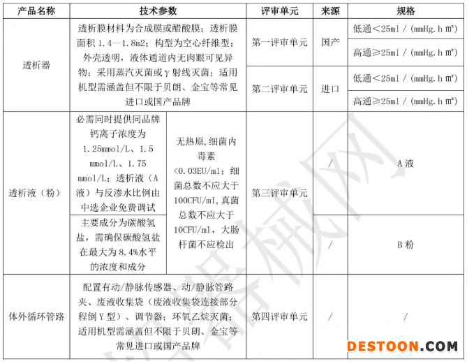 《意見稿》顯示三個采購品種共分為4個評審單元,都明確了技術(shù)參數(shù)需求,其中透析器依據(jù)醫(yī)療器械注冊證分為國產(chǎn)和進口兩個層次,同一層次、同一產(chǎn)品目錄的產(chǎn)品為一個評審單元,同一評審單元視為同一質(zhì)量層次,各評審單元遴選2家生產(chǎn)企業(yè)。