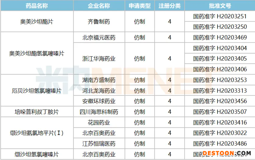 米內(nèi)網(wǎng)數(shù)據(jù)顯示,2020年至今獲批上市的作用于腎素-血管緊張素系統(tǒng)的藥物有11個(gè)(按產(chǎn)品名+企業(yè)統(tǒng)計(jì)),其中奧美沙坦酯氫氯噻嗪片、厄貝沙坦氫氯噻嗪片、纈沙坦氨氯地平片(Ⅰ)、纈沙坦氫氯噻嗪片均屬于血管緊張素II拮抗劑(復(fù)方),涉及華海、方盛、百奧藥業(yè)、恒瑞醫(yī)藥等多家國內(nèi)明星藥企。