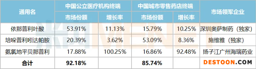 氨氯地平貝那普利目前獲批的國內(nèi)藥企有揚(yáng)子江以及成都地奧制藥集團(tuán),兩家企業(yè)的產(chǎn)品劑量不一樣,在中國公立醫(yī)療機(jī)構(gòu)終端揚(yáng)子江稱霸,在中國城市零售藥店終端則由成都地奧制藥集團(tuán)領(lǐng)軍,但由于醫(yī)院終端銷售體量較大,整體而言揚(yáng)子江仍處于領(lǐng)軍地位。