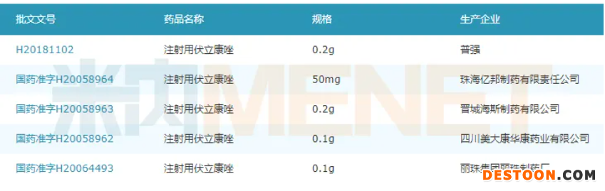 目前獲得注射用伏立康唑生產(chǎn)批文的企業(yè)除了普強(qiáng)(輝瑞旗下公司),還有珠海億邦制藥、晉城海斯制藥、四川美大康華康藥業(yè)以及麗珠集團(tuán)麗珠制藥廠,目前暫無企業(yè)過評(píng)。