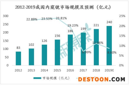 我國(guó)內(nèi)窺鏡行業(yè)近年來(lái)穩(wěn)步發(fā)展,2012年?duì)I收83億元,到2018年已經(jīng)達(dá)到了221億元,預(yù)計(jì)到2019年會(huì)達(dá)到240億元。但增速有所放緩,2018年市場(chǎng)規(guī)模同比增長(zhǎng)11.06%,小于在2016年前超過(guò)20%的增速。