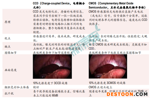 電子內(nèi)窺鏡的核心技術(shù)為圖像采集方式技術(shù),其中圖像傳感器的應(yīng)用則是影像呈現(xiàn)的技術(shù)核心。目前有CCD(電荷耦合元件)和 CMOS(互補(bǔ)式金屬氧化物半導(dǎo)體)兩種技術(shù),CCD技術(shù)由于影像質(zhì)量更好,在電子內(nèi)窺鏡發(fā)展初期被廣泛應(yīng)用,然而,隨著CMOS在色彩性能方面的提升,影像質(zhì)量以及與CCD差距越來(lái)越小,而其低耗能、噪聲小的特點(diǎn)為企業(yè)所欣賞,CCD向CMOS的轉(zhuǎn)變將是未來(lái)一段時(shí)間的發(fā)展趨勢(shì)。