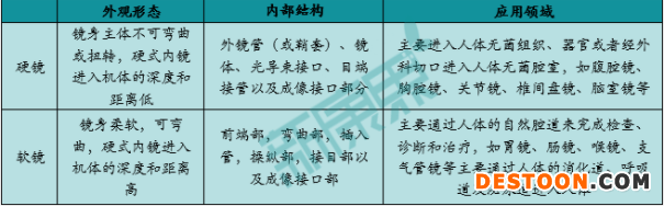 圖表 1 硬鏡與軟鏡形態(tài)、結(jié)構(gòu)和應(yīng)用領(lǐng)域?qū)Ρ?/div>
