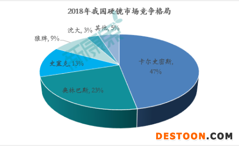 我國(guó)硬鏡市場(chǎng)目前主要被日企和德企瓜分。2018年硬鏡市場(chǎng)前五名中只有沈陽(yáng)沈大一家內(nèi)資企業(yè),市場(chǎng)占比僅為3%,整體國(guó)產(chǎn)企業(yè)市場(chǎng)規(guī)模占比不到10%。其中,德企卡爾史密斯占據(jù)了行業(yè)的半壁江山,有47%的市場(chǎng)份額,日企奧林巴斯緊隨其后,占據(jù)23%的市場(chǎng)。