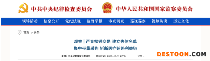 10月17日清晨,中共中央紀律檢查委員會發(fā)布頭條文章《嚴查權(quán)錢交易,建立失信名單,集中帶量采購,斬斷醫(yī)療賄賂利益鏈》。