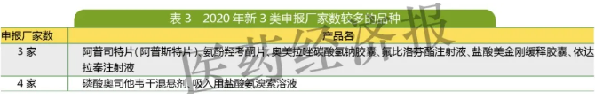 2020年,暫無化學(xué)藥新3類申報廠家數(shù)超過5家的品種。大部分申報新3類的還是國內(nèi)同通用名已有廠家上市的品種,例如美金剛、氟比洛芬、依達拉奉、奧司他韋和氨溴索。這類品種有可能豁免驗證性臨床證據(jù),吸入溶液和注射劑有可能連生物等效性試驗也不用做,實際上所投入的成本和新4類差不多。