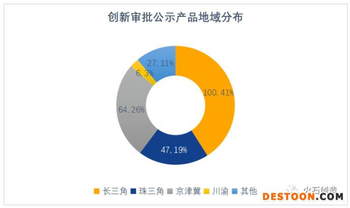 四大集聚區(qū)占比近九成。從地域分布來看,除35個進口產(chǎn)品之外,長三角、珠三角、京津冀和川渝四大產(chǎn)業(yè)集聚區(qū)進入創(chuàng)新審批公示的國產(chǎn)產(chǎn)品數(shù)量占了全國的近九成。
