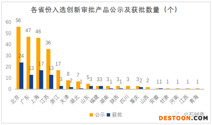 其中,北京(56個)、廣東(47個)、上海(46個)、江蘇(36個)、浙江(17個)牢牢占據(jù)了公示數(shù)和獲批數(shù)的前五。