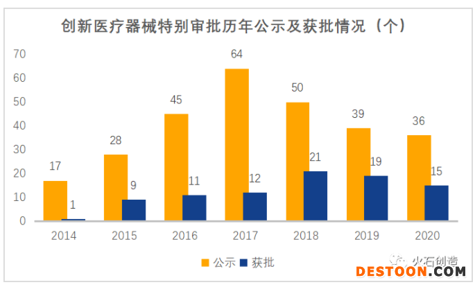 自2017年1月1日實施以來,優(yōu)先審批以公示44個醫(yī)療器械產(chǎn)品,其中21個通過該通道獲批上市,占比接近50%。