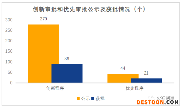 自2014年3月1日實施以來,創(chuàng)新審批每年公示和獲批的產(chǎn)品數(shù)量逐年增加,在2017年前后達到高峰,而2018年修訂后,開始出現(xiàn)下降趨勢。