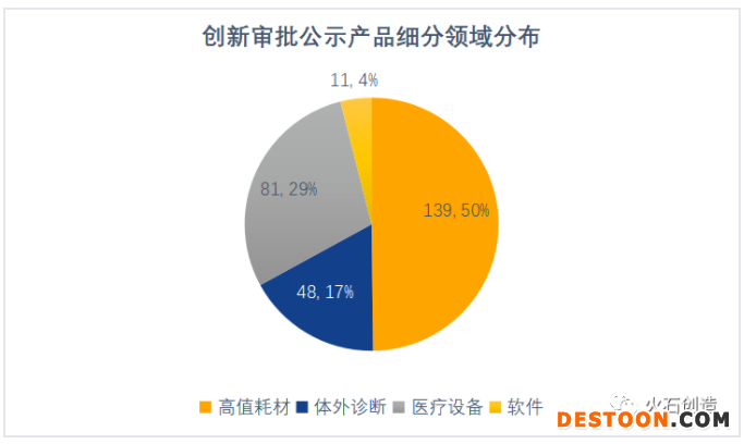 高值耗材占據(jù)半壁江山。從細分領(lǐng)域來看,創(chuàng)新審批公示產(chǎn)品中,心血管、骨科、眼科和牙科等高值耗材占比最大,接近50%,尤其是在基本實現(xiàn)進口替代的血管支架領(lǐng)域,有眾多藥物洗脫支架、覆膜支架和可吸收支架進入創(chuàng)新審批;其次是醫(yī)療設(shè)備(不含體外診斷設(shè)備),占比29%;體外診斷和軟件分別占比17%和4%。