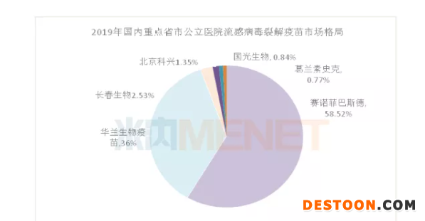 2019年國內重點省市公立醫(yī)院疫苗市場超過3億元,同比上一年增長超過30%,其主要品種仍是人用狂犬病疫苗、人乳頭瘤病毒疫苗、肺炎球菌多糖疫苗占據了前3位,分別占55.81%、20%、6.14%,而流感病毒裂解疫苗、四價流感病毒裂解疫苗和流感病毒亞單位疫苗占1.5%。