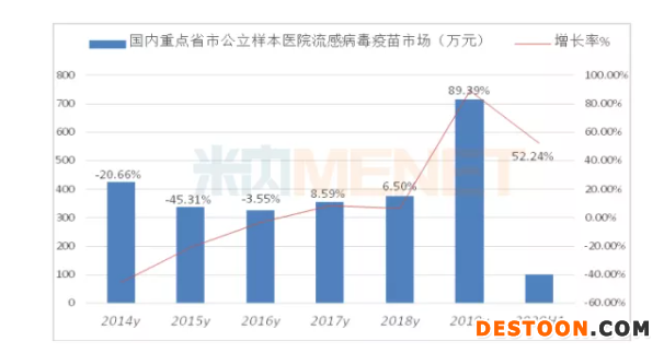 2013年,中國疾控中心監(jiān)測數據:2013年第1周,中國北方省份流感樣病例占門急診病例的4.7%,超過前2年的高峰期水平;也導致了流感疫苗市場走向高點位。新的流感病毒疫苗峰于2019年又一次打破了近兩年沉寂。從公立醫(yī)院流感病毒疫苗市場的數據顯示,呈現出大幅增長,2020年上半年的增長率超過了50%,隨著秋冬的到來,流感疫苗市場有望創(chuàng)下歷史高點。