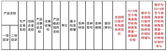 第二輪談判組根據(jù)申報企業(yè)的報價并參考企業(yè)提供的2019年至今青海省醫(yī)療機構(gòu)銷售發(fā)票第一票最低價格、全國現(xiàn)行醫(yī)療機構(gòu)最低供貨價進行談判,議定的價格除以企業(yè)報價形成降幅,最后根據(jù)企業(yè)申報產(chǎn)品的平均降幅情況進行排序,從高到低確定入圍廠家(品牌),國產(chǎn)企業(yè)入圍3家,進口企業(yè)入圍3家。“申報產(chǎn)品報價表”中企業(yè)需要填寫的信息如下所示: