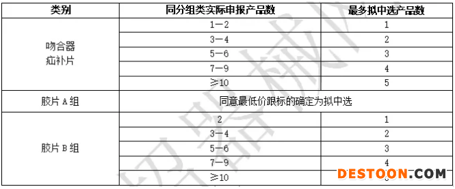 同分組產(chǎn)品根據(jù)的實際申報產(chǎn)品數(shù)量,確定擬中選產(chǎn)品數(shù)量,吻合器和補片同組產(chǎn)品最多中選5個,膠片B組最多中選5個,而膠片A組沒有限制最多中選產(chǎn)品數(shù),只要其他企業(yè)同意最低價跟標(biāo),都可確定為擬中選企業(yè)。