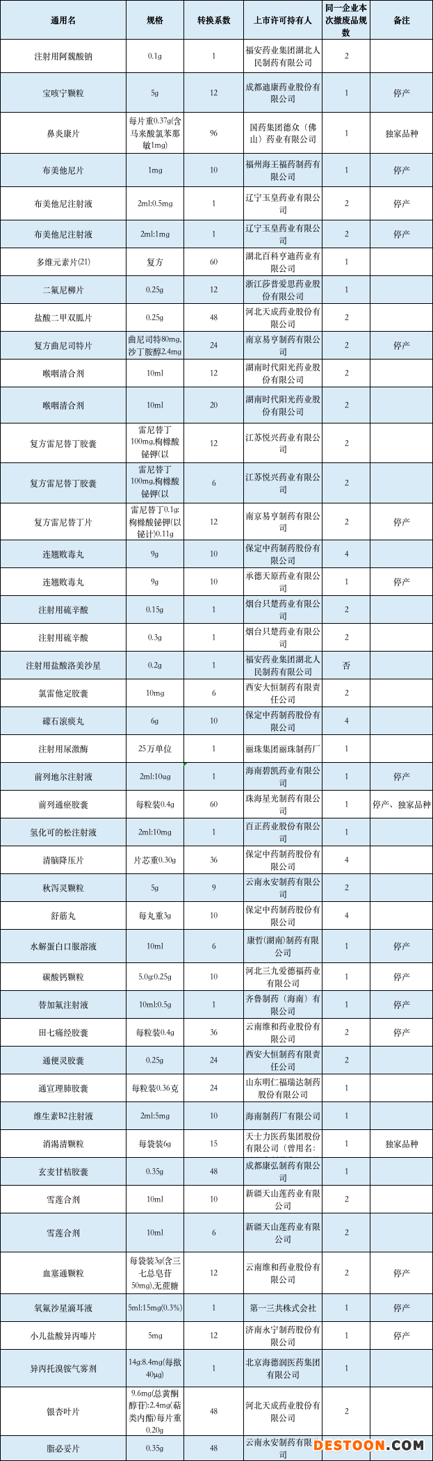 值得注意的是,在申請撤網(wǎng)的藥品中有部分藥企的產(chǎn)品被備注為停產(chǎn),比如寶咳寧顆粒、布美他尼片、復(fù)方曲尼司特片、復(fù)方雷尼替丁片、連翹敗毒片、前列地爾注射液、田七痛經(jīng)膠囊、血塞通顆粒等16個(gè)藥品。